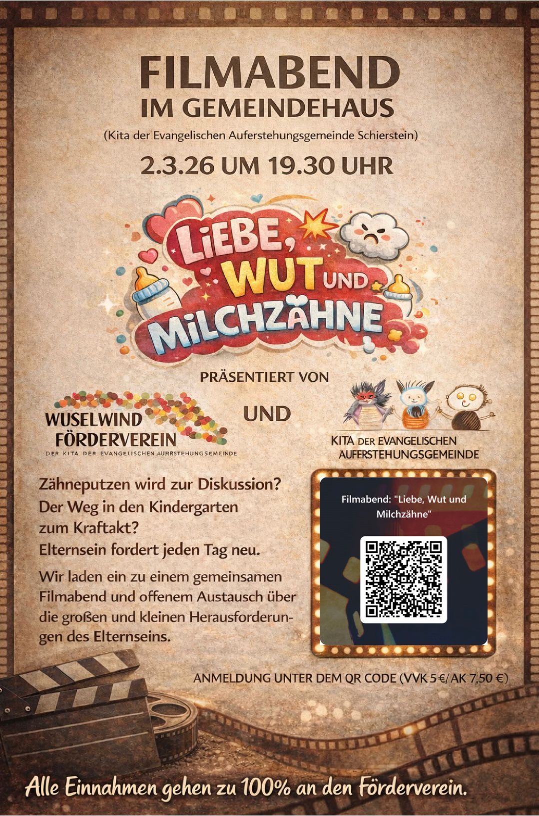 Der Filmabend wird gemeinsam vom Wuselwind Förderverein und der Kita der Evangelischen Auferstehungsgemeinde Schierstein organisiert. Alle Einnahmen kommen zu 100 % dem Förderverein und damit direkt den Kindern zugute.